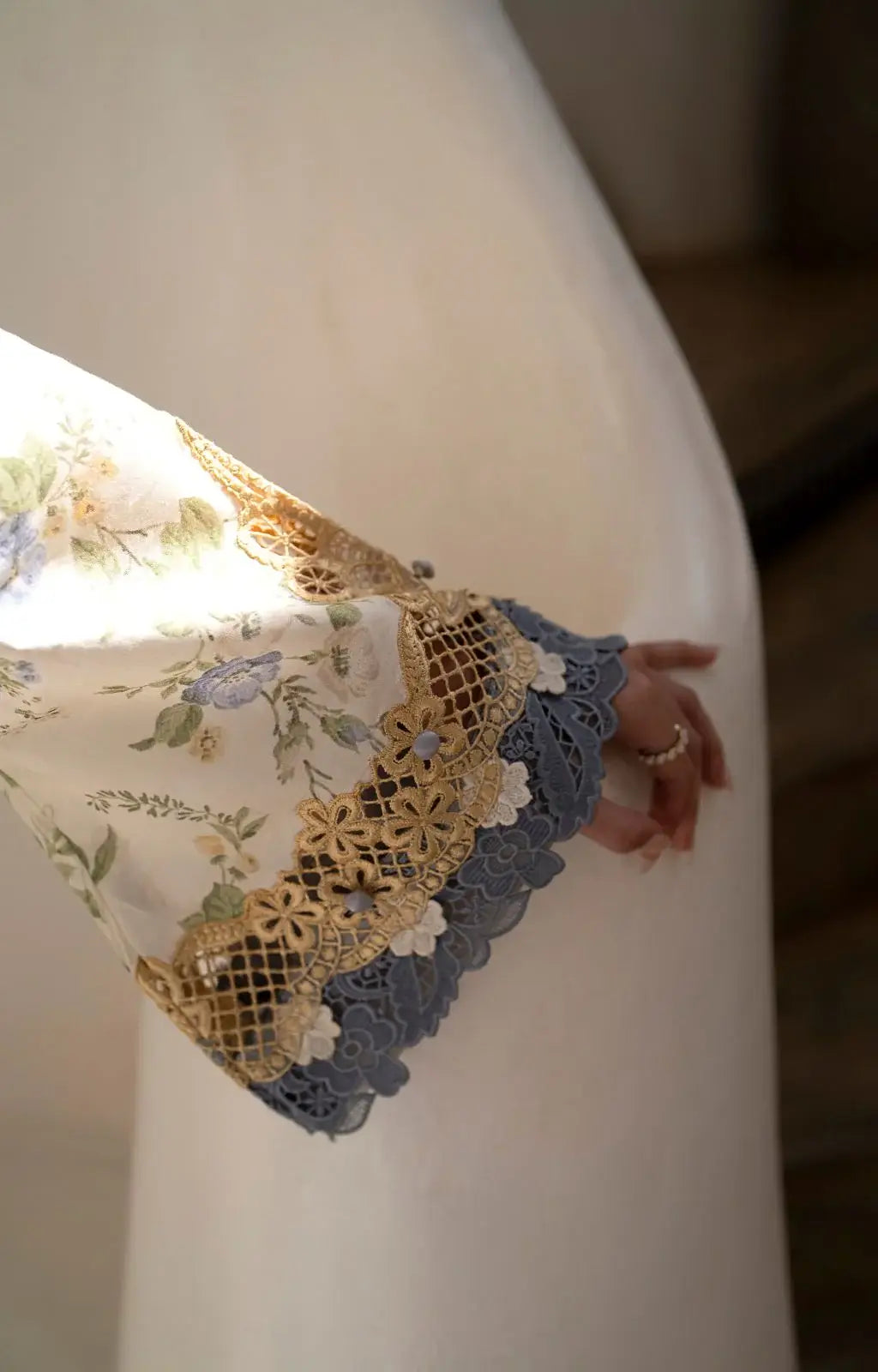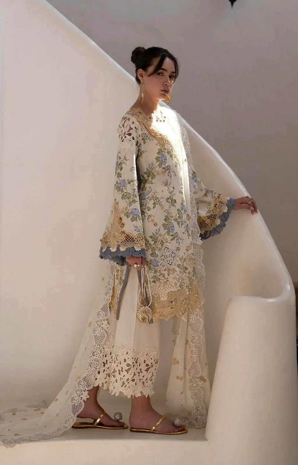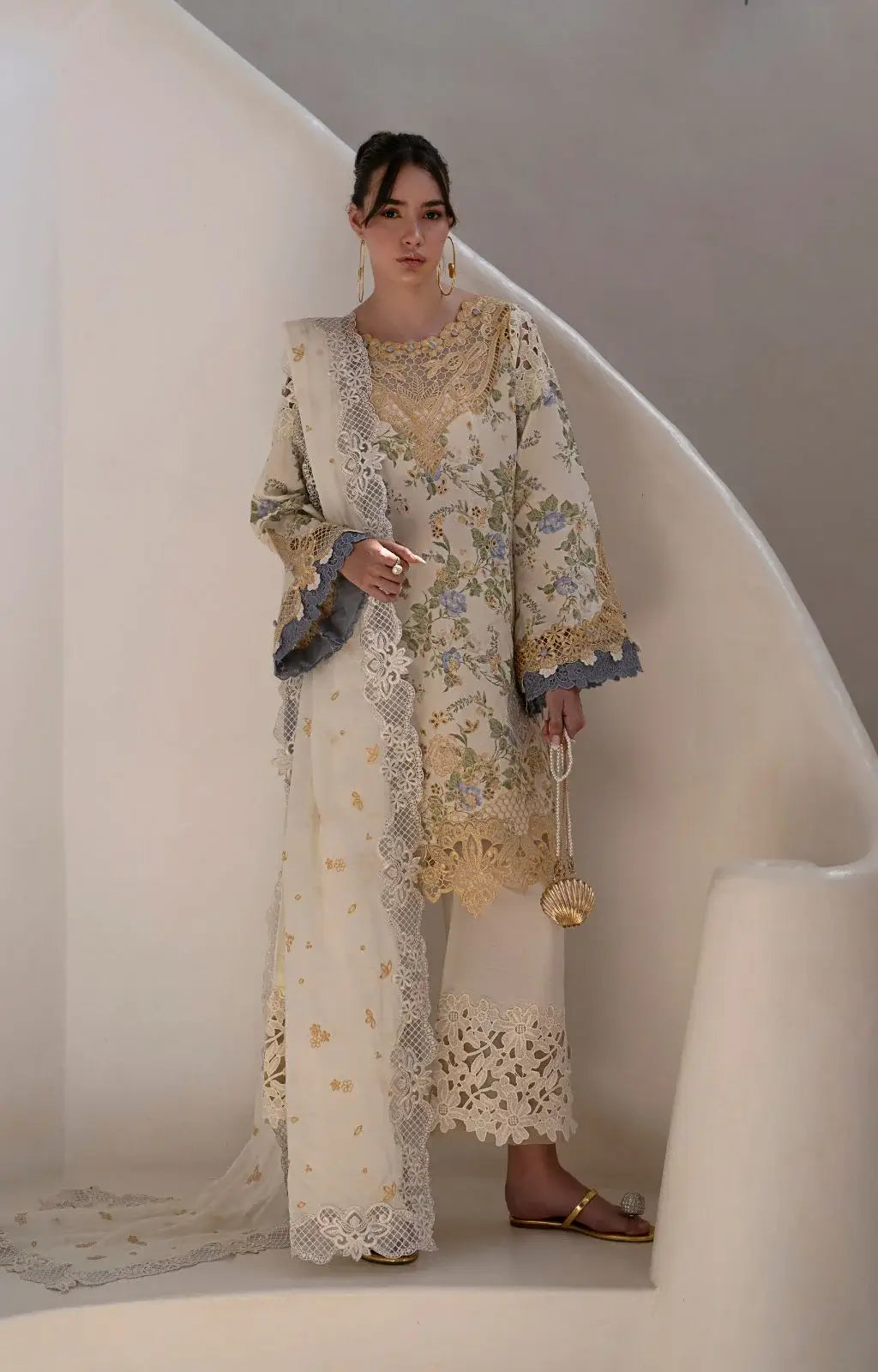 Step into a world of sunshine and delicate blooms with Maze. The pretty beige floral base, featuring hints of yellow, periwinkle, and sage, is instantly uplifting. Yellow resham chikankari embroidery adorns the front, adding delicate texture. The daman showcases composed motifs in organza appliqué, beautifully framed by a lace border on both front and back. Sleeves feature a subtle yellow resham thread border. The outfit is paired with dyed trousers and a Monark fabric dupatta embroidered with an all-over sprat petal design and a 4-sided cutwork embroidered border, creating a truly artistic ensemble.