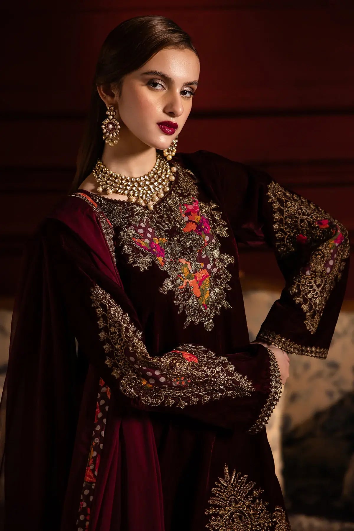 Step into elegance with the Premium Velvet Unstitched Suit CVT4-06, a stunning 3-piece ensemble designed for festive occasions and winter celebrations. Crafted from rich velvet fabric, this outfit features intricate embroidery on the front, sleeves, necklines, and borders, giving it a regal and timeless appeal. The embroidered chiffon dupatta with pallu, motifs, and finishing patti completes the luxurious look, making it the perfect choice for weddings, parties, and formal gatherings.