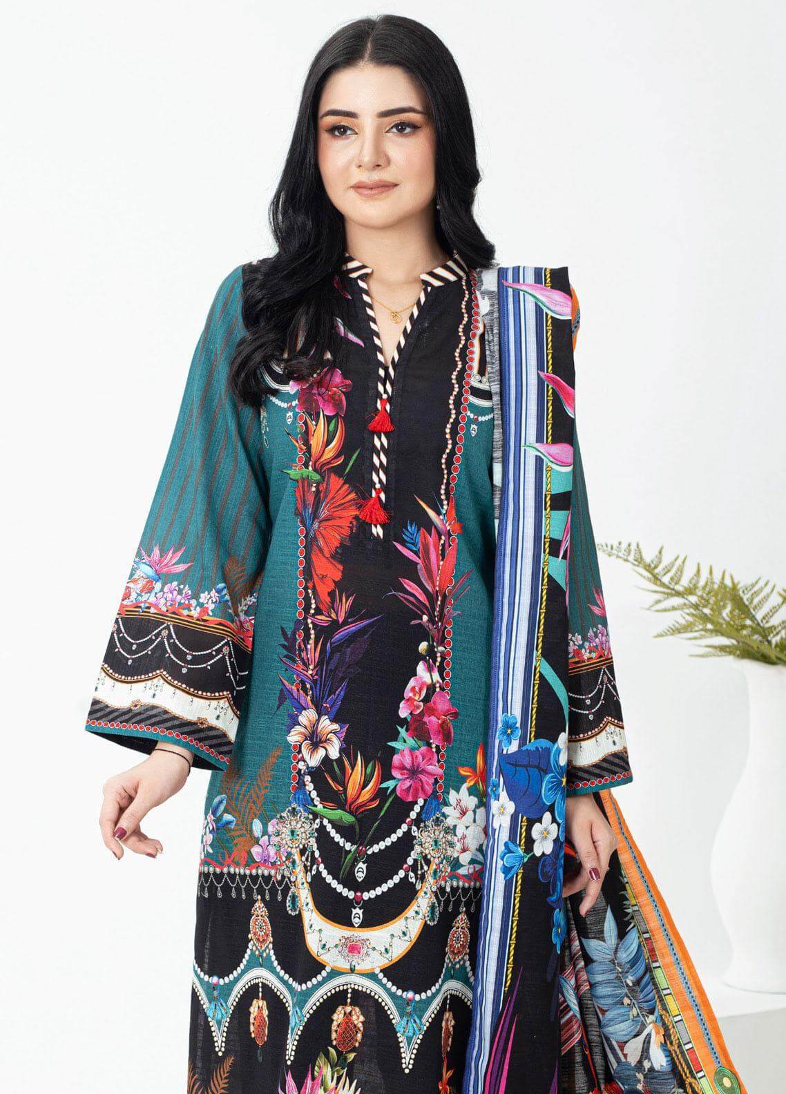 The Gul Ahmed 3 Piece Unstitched Printed Khaddar Suit – WR32010 is a winter wardrobe staple designed for both elegance and comfort. It features a printed shirt, a matching dupatta, and a dyed trouser, all crafted from premium Khaddar fabric. Perfect for casual wear or semi-formal gatherings, this suit ensures style and warmth throughout the season.
