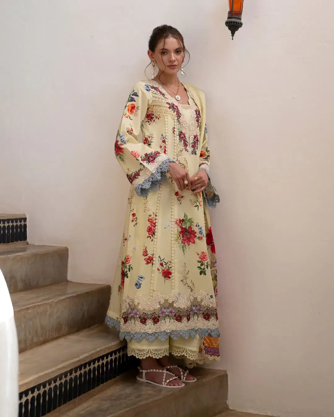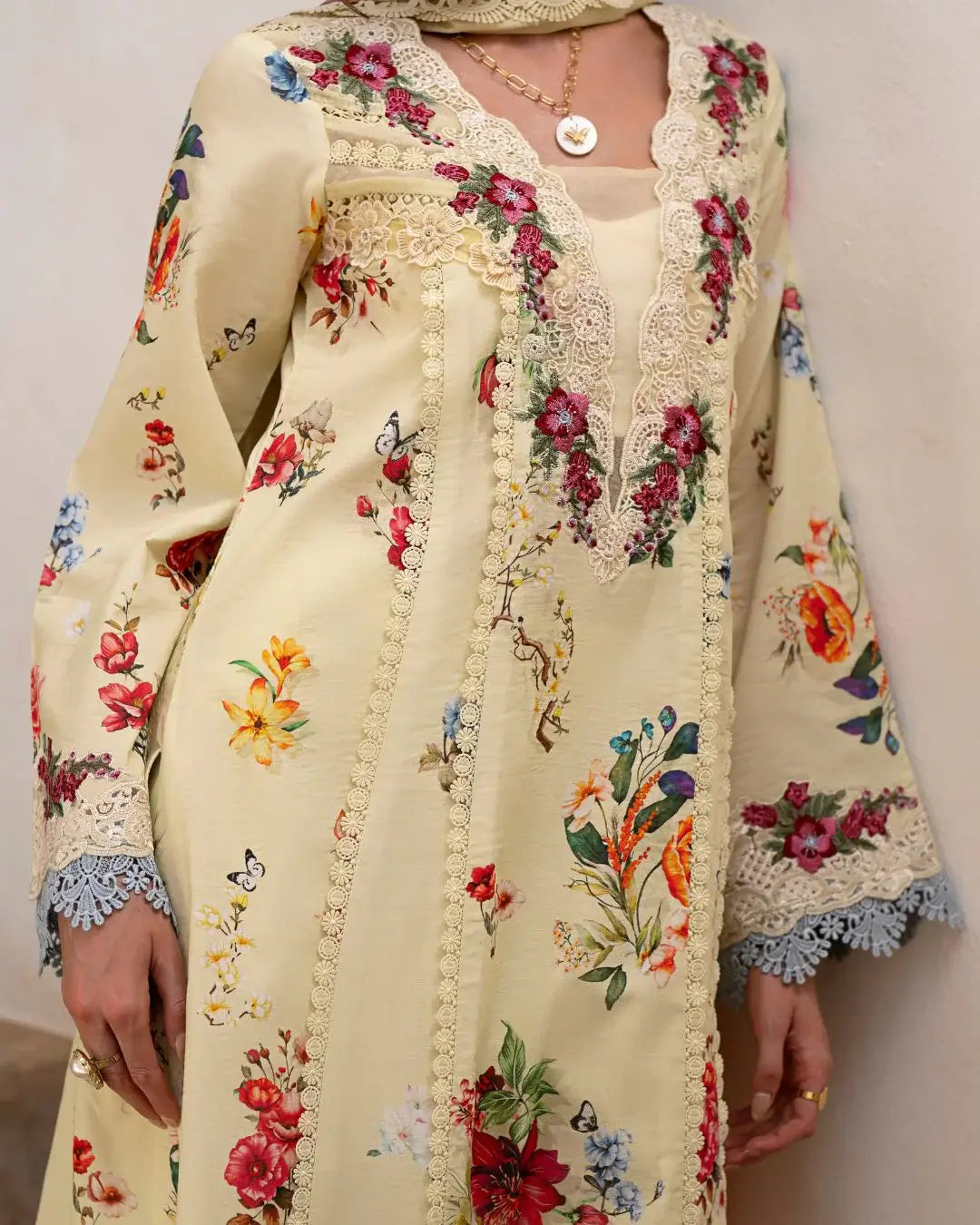 Moonlight is a beautifully printed lawn ensemble enhanced with delicate organza embroidery. Featuring an embroidered neckline, sleeve patches, and a composed daman on organza, it is paired with a printed silk dupatta and lawn trousers for an elegant, festive look.