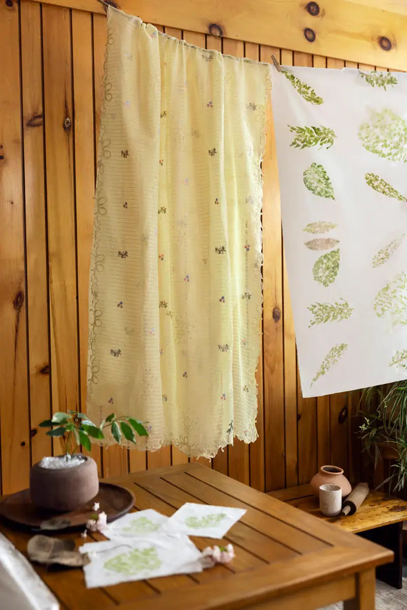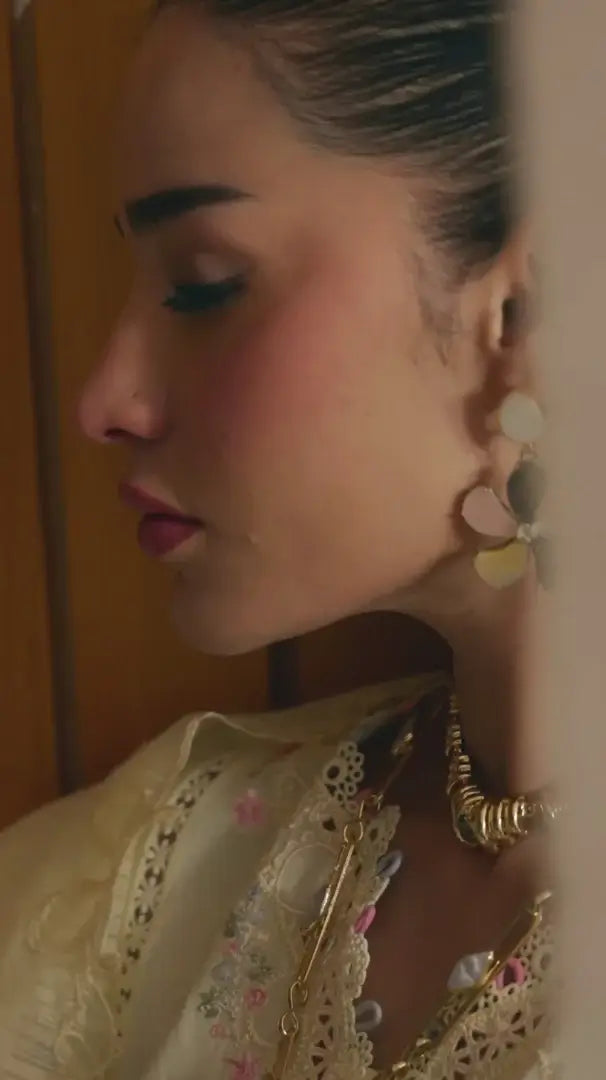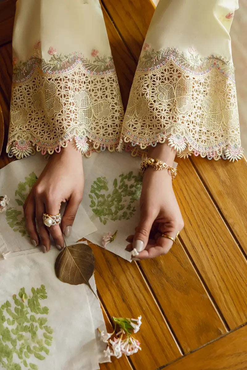 Keva is a stunning ensemble featuring a Chikankari embroidered lawn shirt with intricate center and side panels, elegant borders, and embroidered sleeves. The Jacquard weaved dupatta with four-sided embroidery adds a touch of sophistication, while plain cotton trousers provide comfort. Perfect for formal and semi-formal occasions, Keva blends traditional craftsmanship with modern elegance.