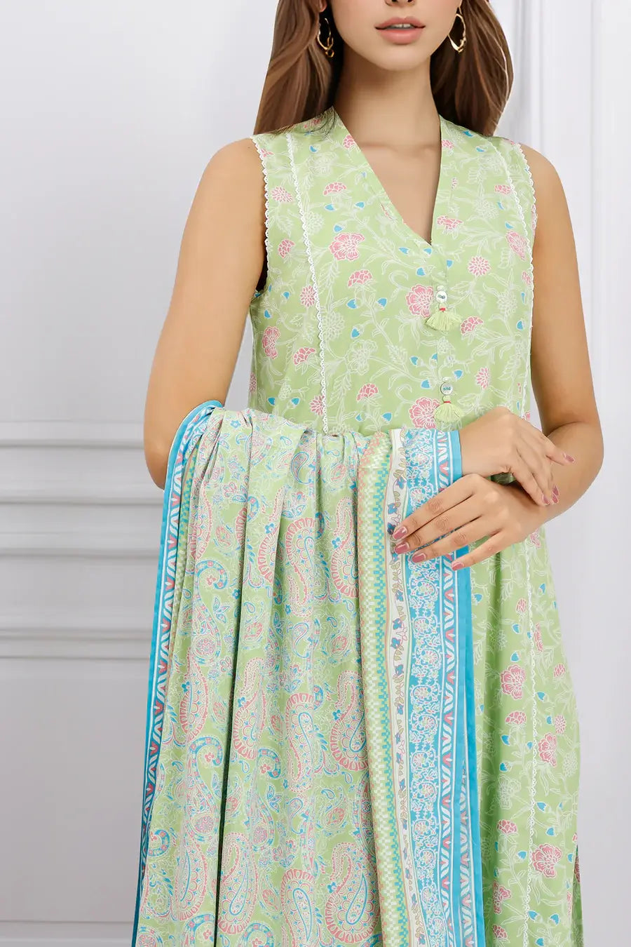 Step into elegance with Unstitched Printed Cotton Viscose 3 Piece U01-24319-20A in a vibrant green shade. This unstitched set features a printed shirt, matching dupatta, and plain trouser crafted from premium cotton-viscose, offering comfort and style for any occasion.