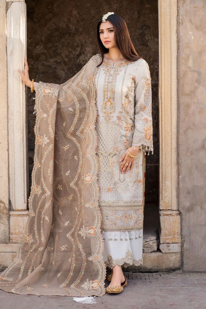 Experience elegance like never before with 𝓜𝓾𝓼𝓱𝓺, a three-piece ensemble that exudes sophistication and charm. The exquisitely embroidered front of the shirt is beautifully complemented by a plain organza back adorned with a delicate embroidered border. The true showstopper is the heavily embroidered organza dupatta, adding an ethereal touch to the look. Paired with plain-dyed raw silk trousers featuring intricate embroidery at the hem, this outfit is nothing short of magical.