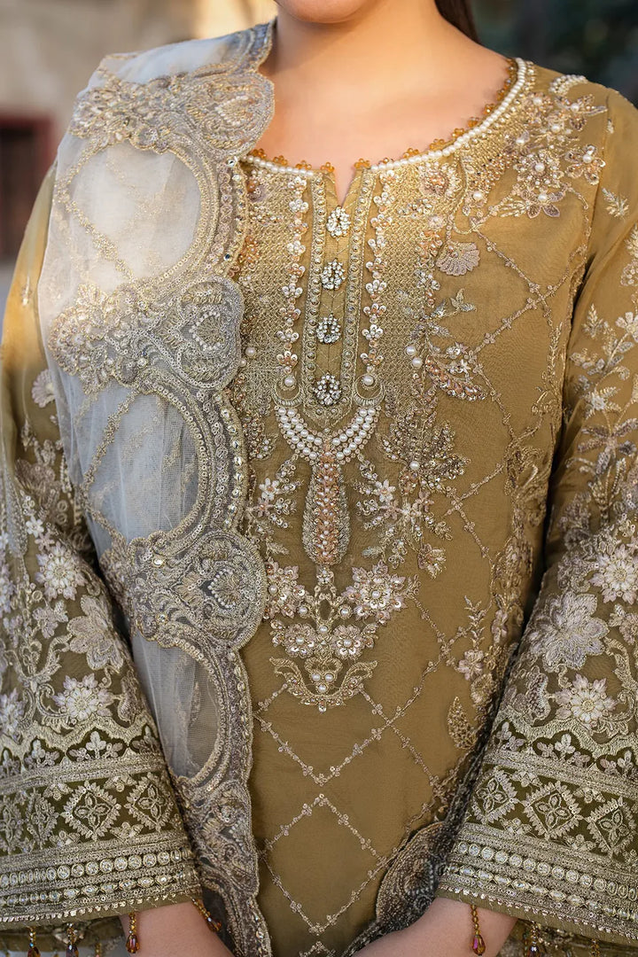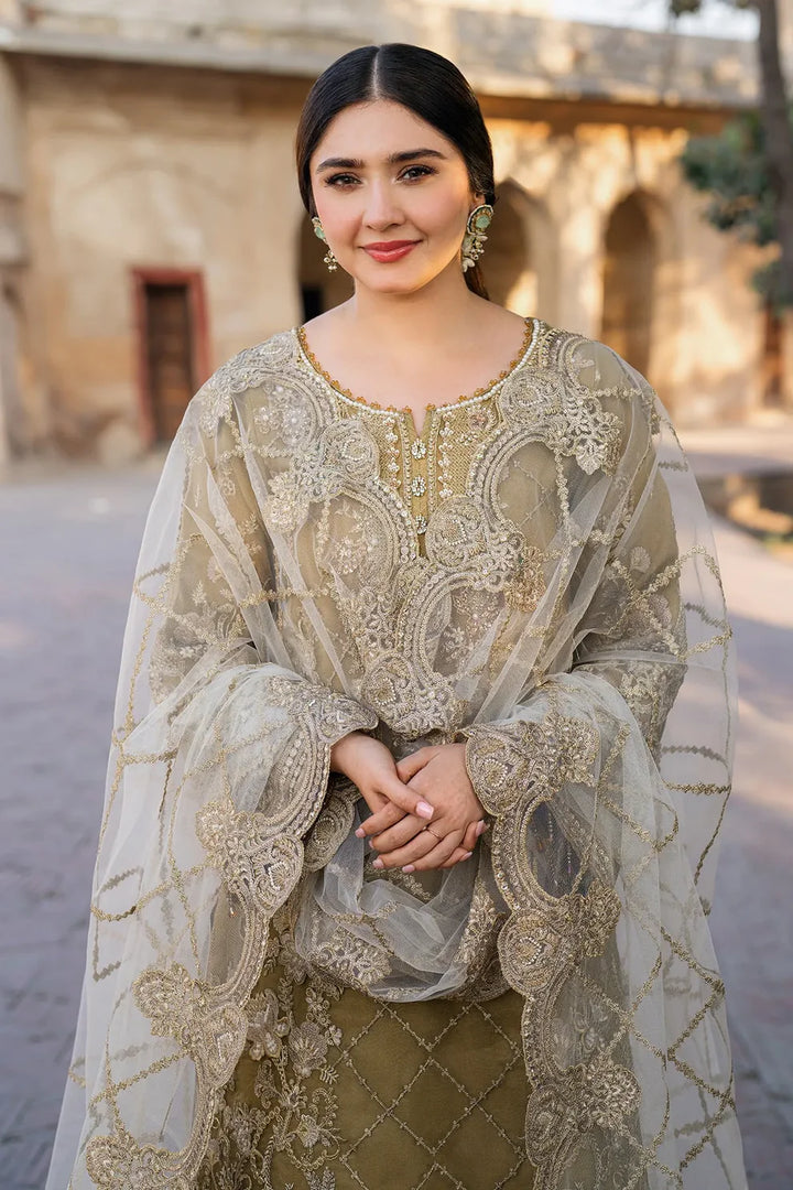The outfit features a delicate organza front with self-embroidery and a scalloped lace hem, complemented by intricate lace and embroidery details on the sleeves. Paired with mustard raw silk trousers and an embroidered net dupatta with lace detailing, this refined ensemble is perfect for Eid and festive occasions.