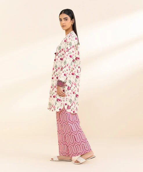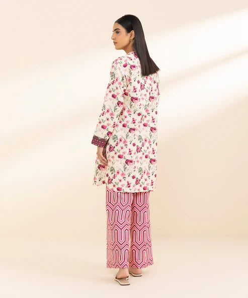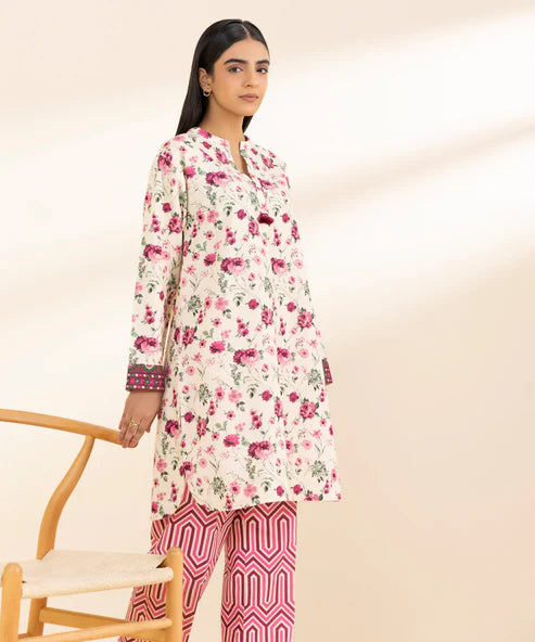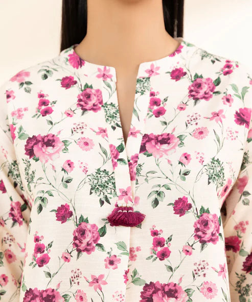 Make a statement with our magenta and off white two-piece printed light khaddar ensemble featuring floral prints.