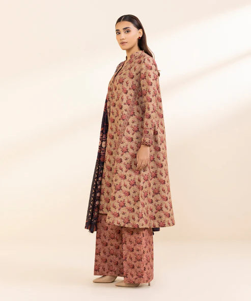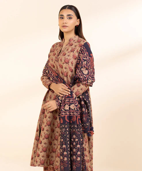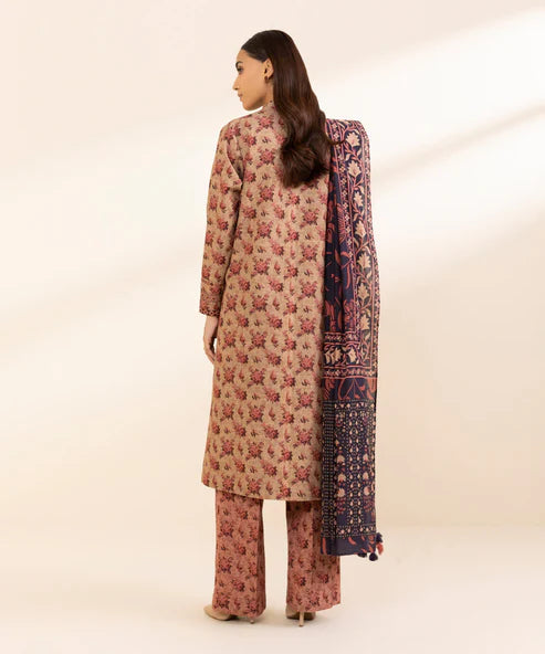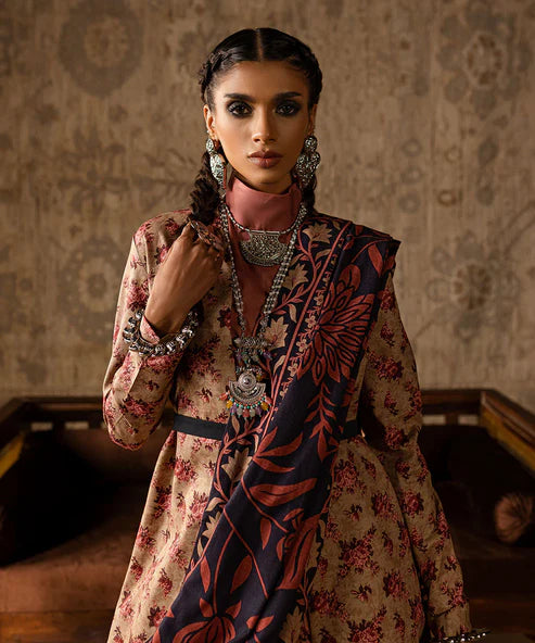 Curate the perfect winter outfit with our Two-piece dark purple and coral pink printed khaddar suit with a blended shawl.
